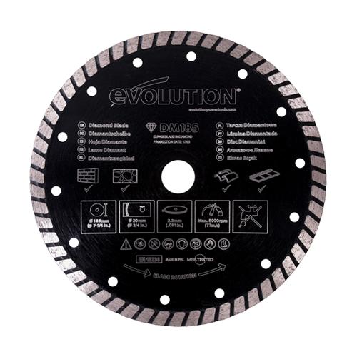 - 185 mm: diamantový kotouč s děleným turbo segmentem pro řezání zdiva (Pouze pro pokosové pily, např. EVOLUTION R185SMS+)