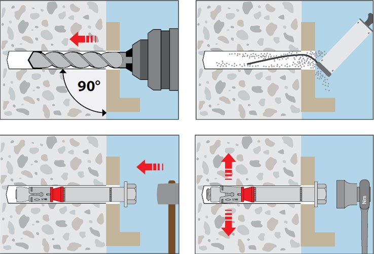 - kotvení lešení, výškových regálů, strojů, sĺoupů, stožárů, fasádních systémů atd.