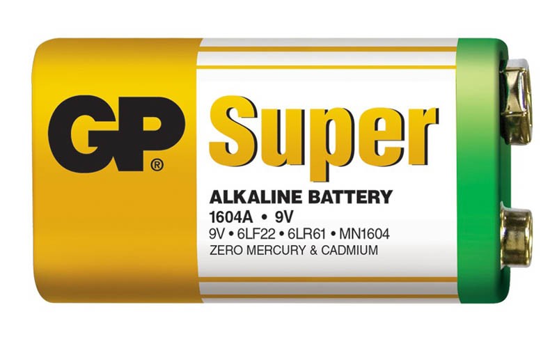 Jednorázová baterie deväťvoltová (9 V), alkalický (RAM) článek, napětí až 9 V.