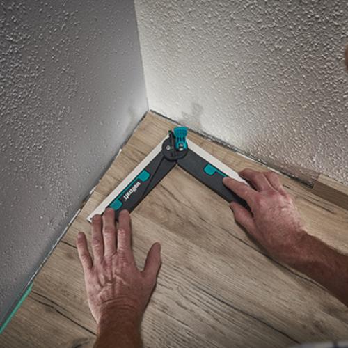 Úhloměr pro kapovací a pokosové pily vám umožní přesné a pohodlné snímání úhlů s následným přenesením na kapovací a pokosovou pilu. V prvním kroku posuňte obě dvě plastová ramena do rohu stěny a vyrovnejte je podél stěn. Pomocí excentrické páčky zafixujte polohu. Páčka je zkonstruovaná tak, aby se dala i v úzkých pracovních oblastech dobře ovládat. V dalším kroku úhloměr pomocí dvou integrovaných magnetů upevněte na pilový list a vyrovnejte úhel přesně podle nastavitelných dorazů na pile. Při řezání se automatická osa úhlu postará o správný pokosový řez, což ulehčuje práci a snižuje riziko chyb na nulu. Kromě toho vnější rohy můžete pohodlne snímat pomocí vytahovacích rohových snímačů. I doraz je výklopný, což vám umožní naznačení úhlů přímo na obrobek.