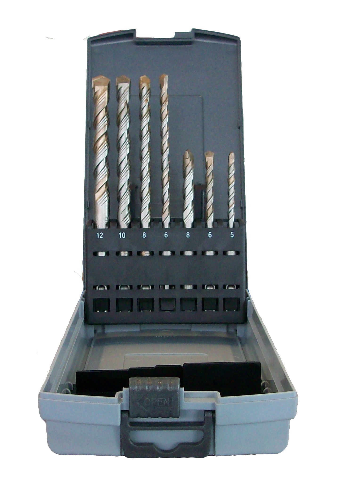 7 ks sada příklepových vrtáků s uchycením SDS plus. Doporučené do betonu, cihly, kamene a jiných stavebních materiálů.